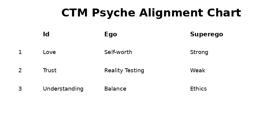 If CTM was primarily Superego-driven for someone, their mindfulness practice would likely focus on ethics, moral reasoning, and aligning thoughts and behaviors with deeply held values. They might use CTM as a way to cultivate self-discipline, a strong sense of responsibility, and an internal moral compass to guide their actions. This person may emphasize mindfulness techniques that reinforce ethical decision-making, self-restraint, and a commitment to social or philosophical ideals. Their practice would be less about managing impulses (Id) or balancing self-worth with reality (Ego) and more about ensuring their thoughts and behaviors align with their highest principles.